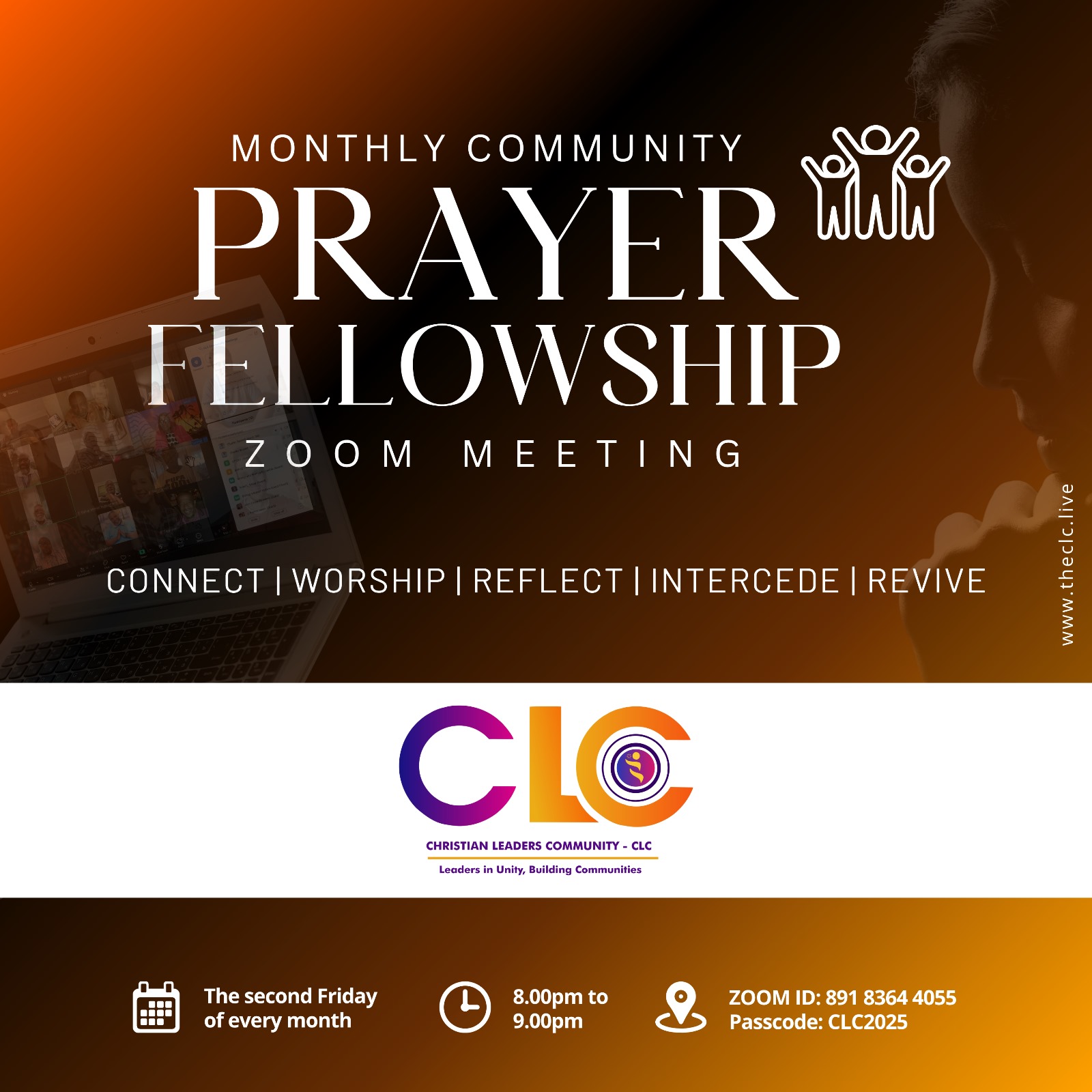CLC Monthly Community Prayer Fellowship CONNECT | WORSHIP | REFLECT | INTERCEDE | REVIVE Our Monthly Community Prayer Fellowship is a sacred hour of worship, reflection, and intercession for our